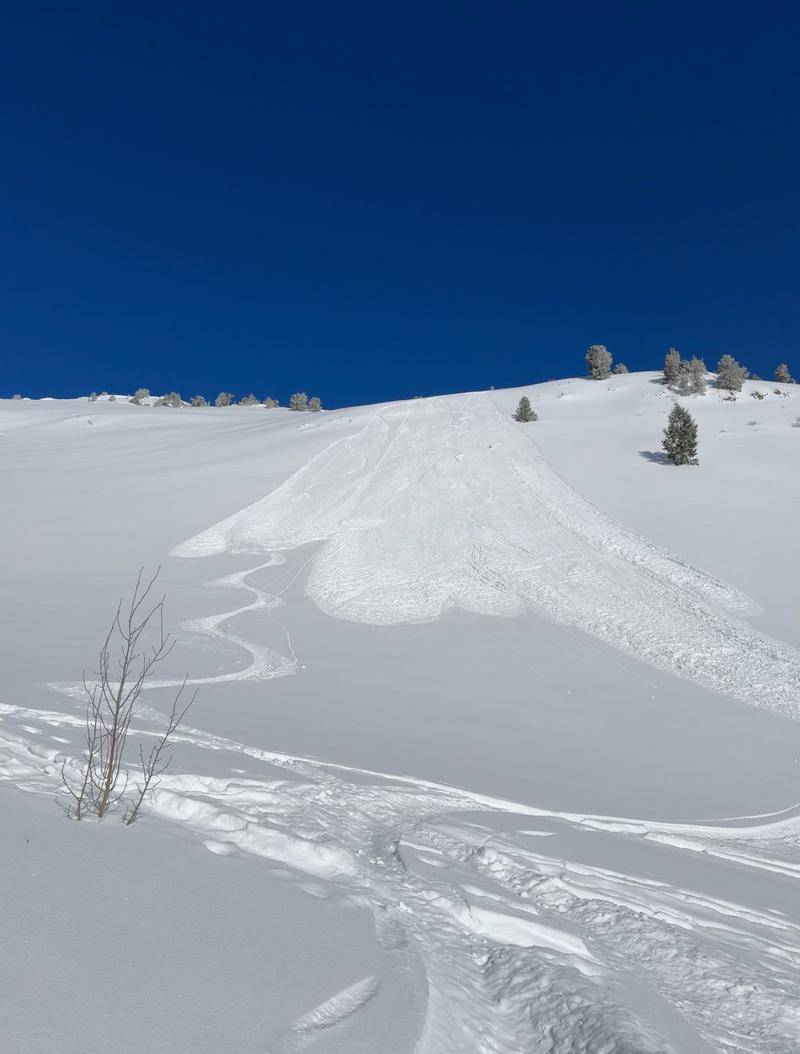 South facing snow had become damp from the strong spring sun when we exited at midday. The same sluffing events triggered from turns in steeper portions of the slope were present after taking on a lot of heat today.