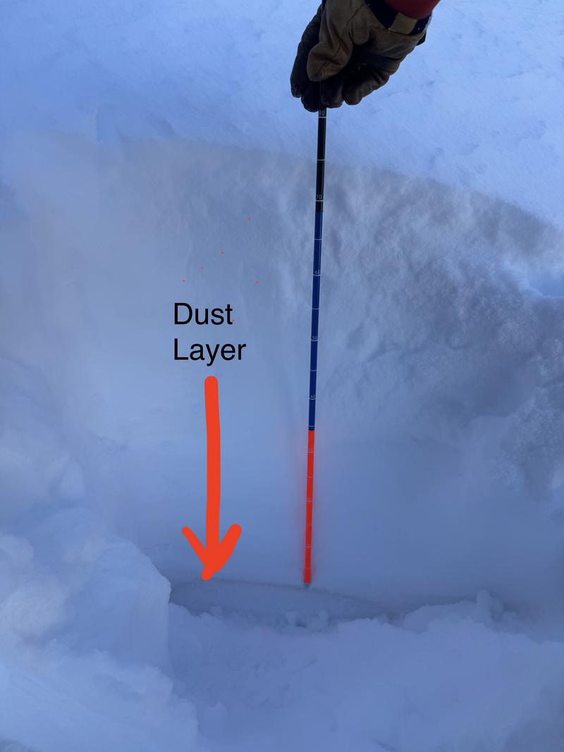 I was in the field from 12-4pm traveling from 8k' to a bit over 9k' elevation, everything except for steep sheltered northerly slopes was already damp by this time of day. Sheltered northerly around 9k' and above seemed to stay cold and dry all day and will likely be the only snow without a crust of some sort tomorrow in this zone. Steep solars went through a wet loose cycle as expected, and there was only one storm slab I saw today that I submitted in an avalanche ob. I got eyes on a few of the repeaters in this zone but none of them avalanched this week, curious to see what they do as the winter goes on. HS in this zone is now ~160cm at 8k' and around 200-240cm above 9k'. There's 75cm of new snow on top of the dust layer here. Only test I did was a hand shear and I got a clean shear on a density change about 15cm above the dust layer, and also got a clean shear directly below the dust layer. I tried to move snow on some test slopes but nothing would budge, and there were tons of sled tracks on everything steep with no results.