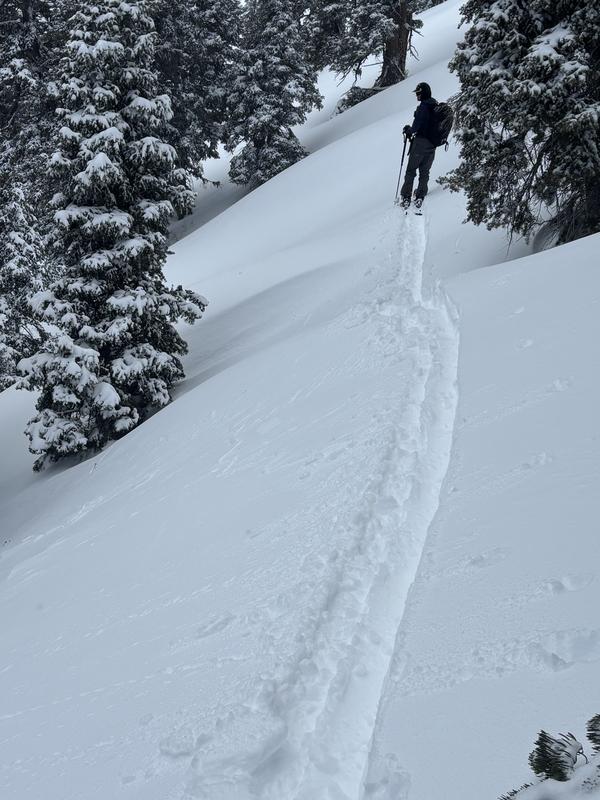 Our first lap up and down was perfect. Relatively clear skies made it possible to see some old wet slide debris, as well as a handful of small slides from the new snow on either side of the bowl. Our second lap is where we ran into trouble. During our transition clouds moved in quickly severely limiting visibility, forcing us to move very slowly down the bowl, we ended up on some steeper portions of the slope, which is where we saw most of the soft slab cracking/failing. Ultimately we had to follow (and ruin) the skin track down as it was the only thing we could see besides our skis on our feet.