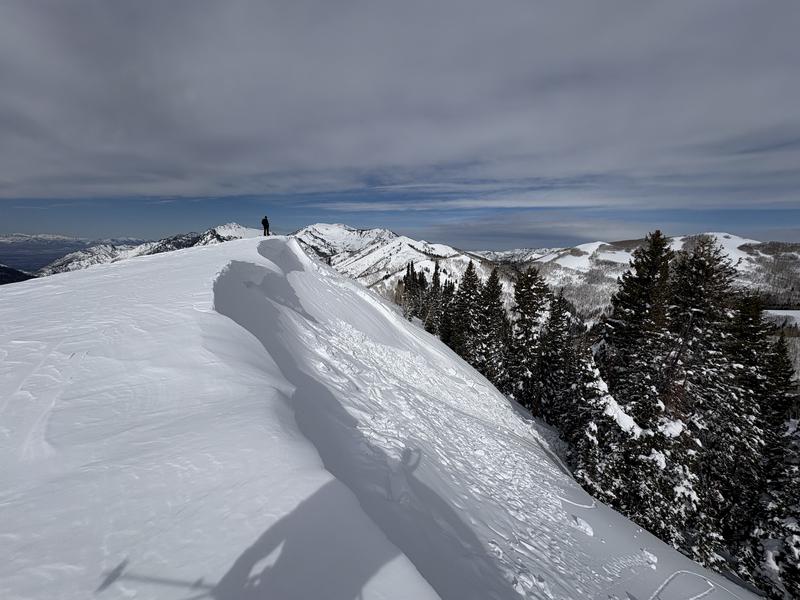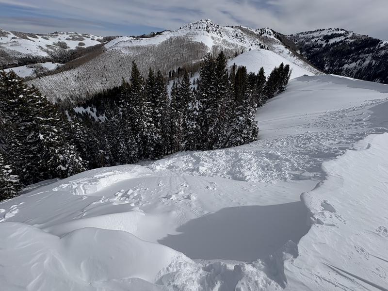 At top of short swing observed Cornice formation with assumed natural release in the past 1-3 days. Wind drift slab below broke from 16"-36" crown, 90ft wide, ran 100ft into trees. See photos
