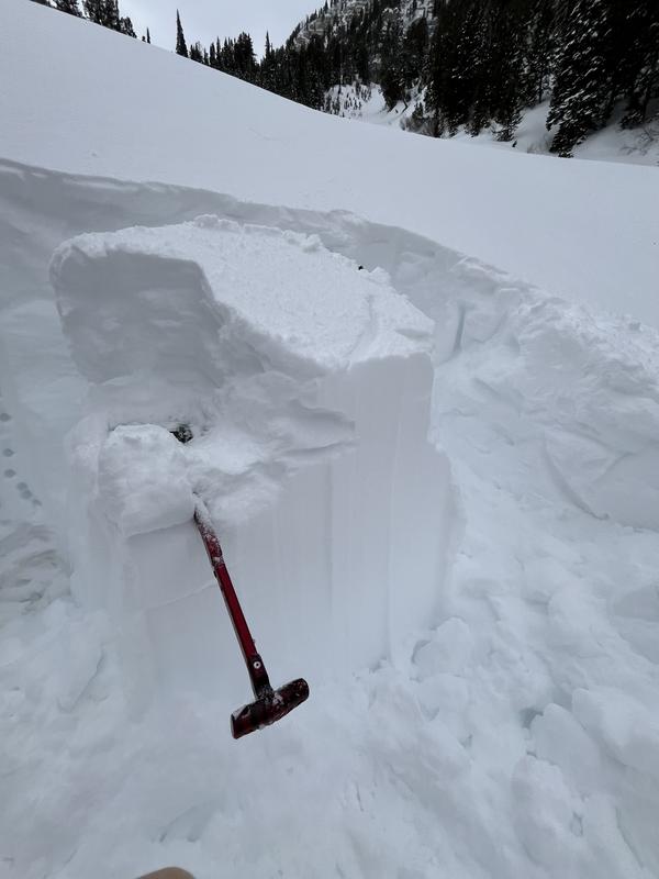 This last storm added some much needed snow to the lower elevations around timp and provided excellent riding conditions.I dug a pit on a 35 degree, north facing slope at 8500 ft and had an unreactive ECT. There is a graupel layer at 45 cm down that I would be most worried about in wind loaded areas and along ridge lines. This layer was unreactive in my pits and I could not get it to propagate.