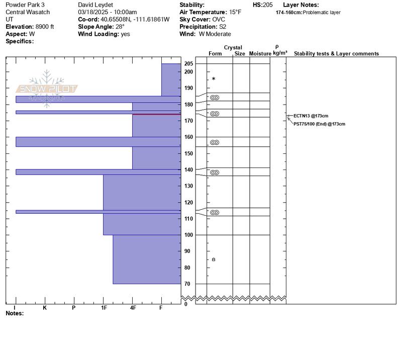 Our test pit on a west aspect showed several melt-freeze crusts. The most problematic was the second crust at 174-176 cm. The layer of snow beneath this crust had a crack initiate but no propagation (ECTN13). Our propagation saw test had similarly stubborn results - PST 75/100 (END).
