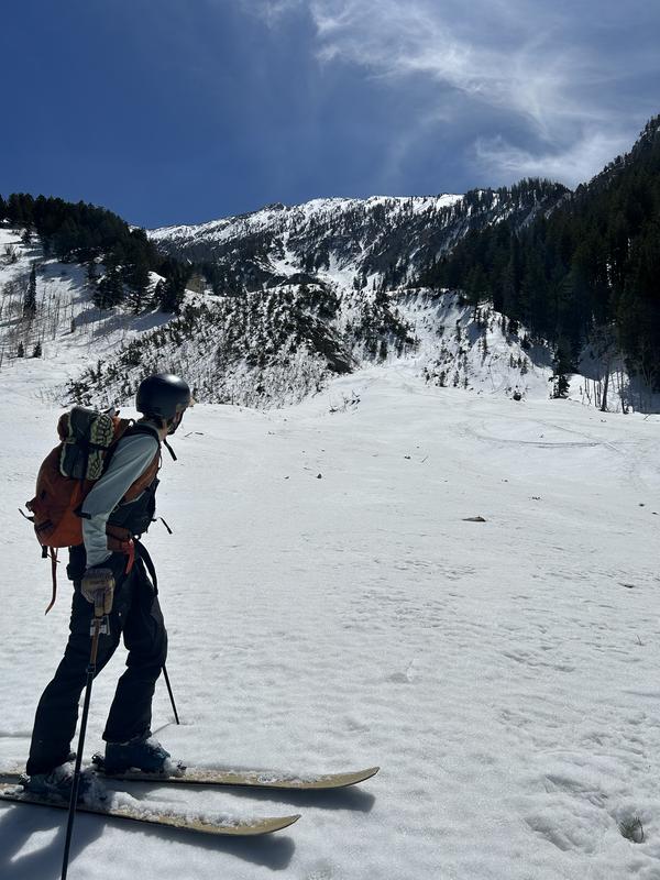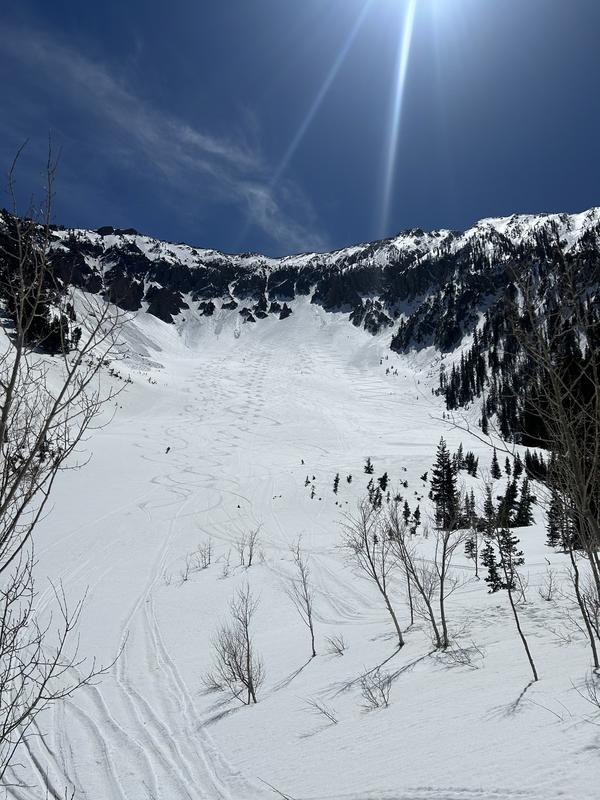 First signs of an overnight freeze at 9000'. Above 9000' snow was supportable on boots in the morning. Recent wet loose avalanche activity on the west facing observed. The cornice on the East facing ridge above the NW couloir was the primary concern in terrain traveled. Evidence of a widespread natural cycle observed from the last new snow event.