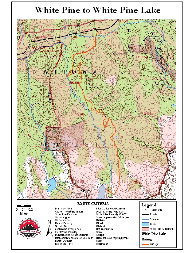 White Pine Trailhead to White Pine Lake: Stunning tour through and under multiple avalanche paths, including Scotty’s Bowl, the Birthday Chutes and the Tri-Chutes. Park 5.2 miles beyond electronic signage at the mouth of LCC and look for the White Pine lot on your right. Cross the creek at the bridge and follow the summer trail 4 miles, gaining 2400’ into the upper reaches of White Pine to the lake. Not recommended for large parties. Dogs are not allowed in the watershed of LCC.