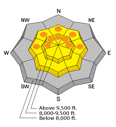 weather Increased cloud cover, a warming trend, and sustained moderate to strong northwest winds are in store for the mountains today. We'll see temps rising to the low to mid 20s at 10,000', the upper 20s to low 30s at 8000'. The northwesterlies keep their momentum through the afternoon, blowing 35-40mph along the most exposed ridgelines. Some spits of precipitation and riming may be possible over the next few days with alternating warm air advection and minor cold fronts. It all may add up to a few inches here and there tomorrow and again Thursday night. Most of the energy, wind and precip looks to ride to the north of us. |