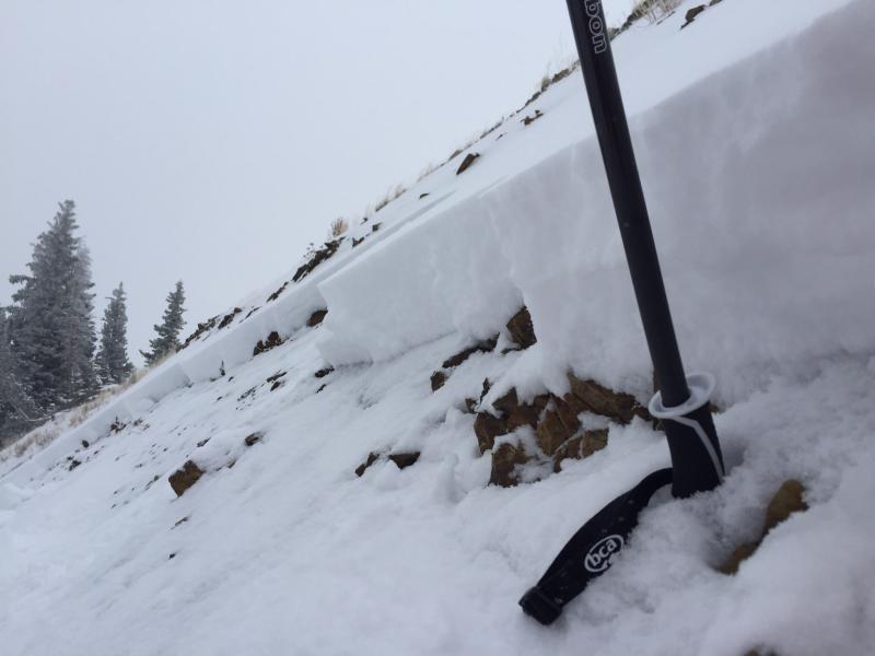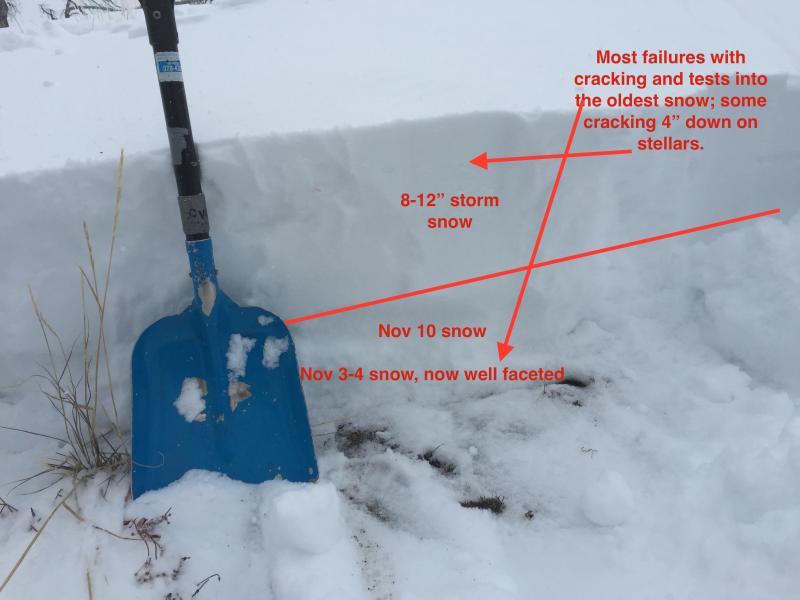 The old snow from Nov 3rd and 4th remains the weakest snow in the snowpack and needs just enough of a load from additional snow and wind to become active. The culprit layer is generally relegated to the west to north to east facing slopes above about 9000' and is easily discerned when pawing down with your hand for a quick hand pit. The grey, granular, unconsolidated grains have a completely different shape, feel, texture, color - even taste - than the new snow and wind drifts. See photo below. With enough of wind and snow, these persistent slabs may be triggered by the weight of a person on - or adjacent to - the slope. Collapsing, "whumphing" are immediate signs of localized instability. Click on the 'i' next to the infographic for more info. |
